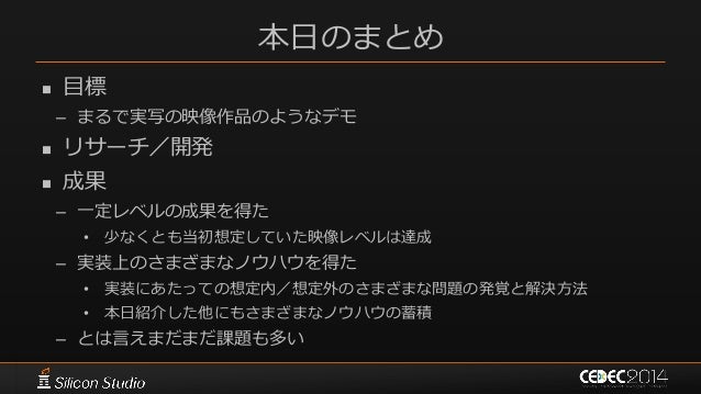 142. 142. 本日のまとめ  目標 – まるで実写の映像作品のようなデモ  リサーチ/開発  成果 – 一定レベルの成果を得た • 少なくとも当初想定していた映像レベルは達成 – 実装上のさまざまなノウハウを得た • 実装にあたっての想定内/想定外のさまざまな問題の発覚と解決方法 • 本日紹介した他にもさまざまなノウハウの蓄積 – とは言えまだまだ課題も多い