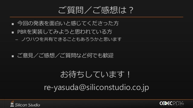 143. 143. ご質問/ご感想は?  今回の発表を面白いと感じてくださった方  PBRを実装してみようと思われている方 – ノウハウを共有できることもあろうかと思います  ご意見/ご感想/ご質問など何でも歓迎 お待ちしています! re-yasuda@siliconstudio.co.jp