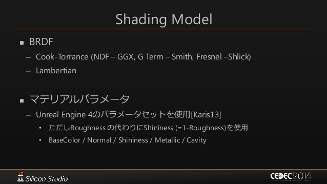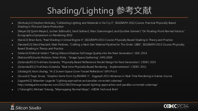 145. 145. Shading/Lighting 参考文献  [McAuley12] Stephen McAuley, “Calibrating Lighting and Materials in Far Cry 3”, SIGGRAPH 2012 Course: Practical Physically Based Shading in Film and Game Production  [Meyer10] Quirin Meyer1, Jochen Süßmuth1, Gerd Sußner2, Marc Stamminger1 and Günther Greiner1 “On Floating-Point Normal Vectors” Eurographics Symposium on Rendering 2010  [Karis13] Brian Karis, “Real Shading in Unreal Engine 4”, SIGGRAPH 2013 Course: Physically Based Shading in Theory and Practice  [Neubelt13] David Neubelt, Matt Pettineo, “Crafting a Next-Gen Material Pipeline for The Order: 1886”, SIGGRAPH 2013 Course: Physically Based Shading in Theory and Practice  [Valient14] Michal Valient “Taking Killzone Shadow Fall Image Quality into the Next Generation”, GDC 2014  [Robison09] Austin Robison, Peter Shirly , “Image Space Gathering”, HPG 2009  [Gotanda2013] Yoshiharu Gotanda, “Physically Based Reflectance Model Design for Next Generation”, CEDEC 2013  [Gotanda2011] Yoshiharu Gotanda, “Real-time Physically Based Rendering - Implementation”, CEDEC 2011  [Uludag14] Yasin Uludag, “Hi-Z Screen-Space Cone-Traced Reflections” GPU Pro 5  [Sousa13] Tiago Sousa, “Graphics Gems from CryENGINE 3”, Siggraph 2013 Advances in Real-Time Rendering in Games Course  [Lagarde12] Sébastien Lagarde “Lighting approaches and parallax-corrected cubemap” http://seblagarde.wordpress.com/2012/09/29/image-based-lighting-approaches-and-parallax-corrected-cubemap/  [ Toksvig04 ] Michael Toksvig, "Mipmapping Normal Maps", nVIDIA Technical Brief