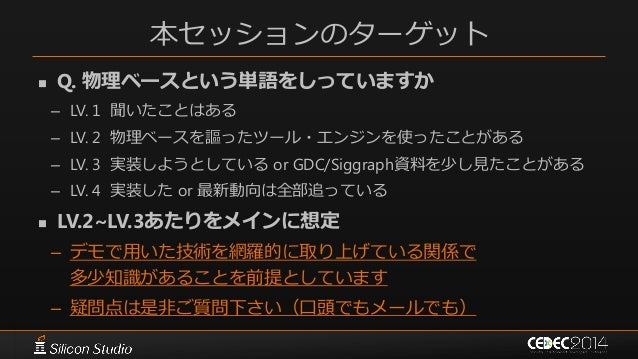 2. 2. 本セッションのターゲット  Q. 物理ベースという単語をしっていますか – LV. 1 聞いたことはある – LV. 2 物理ベースを謳ったツール・エンジンを使ったことがある – LV. 3 実装しようとしている or GDC/Siggraph資料を少し見たことがある – LV. 4 実装した or 最新動向は全部追っている  LV.2~LV.3あたりをメインに想定 – デモで用いた技術を網羅的に取り上げている関係で 多少知識があることを前提としています – 疑問点は是非ご質問下さい(口頭でもメールでも)