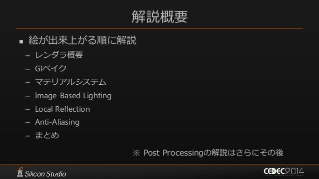 25. 25. 解説概要  絵が出来上がる順に解説 – レンダラ概要 – GIベイク – マテリアルシステム – Image-Based Lighting – Local Reflection – Anti-Aliasing – まとめ ※ Post Processingの解説はさらにその後