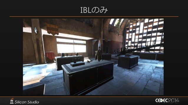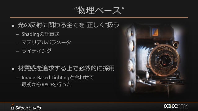 27. 27. “物理ベース”  光の反射に関わる全てを”正しく”扱う – Shadingの計算式 – マテリアルパラメータ – ライティング  材質感を追求する上で必然的に採用 – Image-Based Lightingと合わせて 最初からR&Dを行った