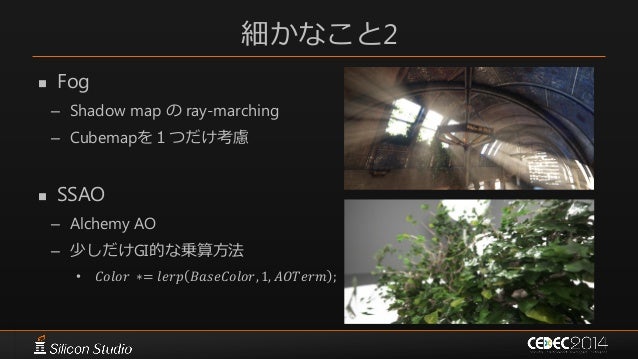 31. 31. 細かなこと2  Fog – Shadow map の ray-marching – Cubemapを1つだけ考慮  SSAO – Alchemy AO – 少しだけGI的な乗算方法 • 𝐶𝑜𝑙𝑜𝑟 ∗= 𝑙𝑒𝑟𝑝 𝐵𝑎𝑠𝑒𝐶𝑜𝑙𝑜𝑟, 1, 𝐴𝑂𝑇𝑒𝑟𝑚 ;