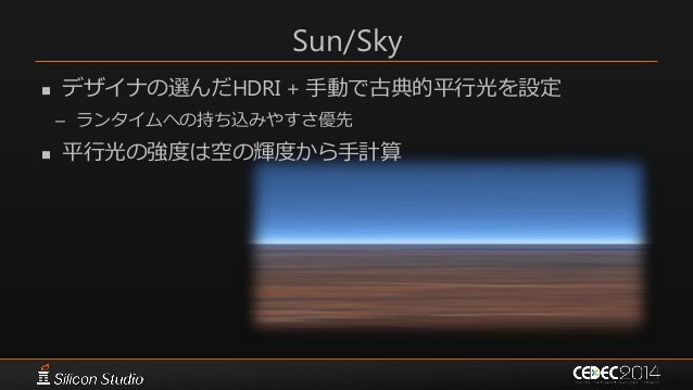 35. 35. Sun/Sky  デザイナの選んだHDRI + 手動で古典的平行光を設定 – ランタイムへの持ち込みやすさ優先  平行光の強度は空の輝度から手計算