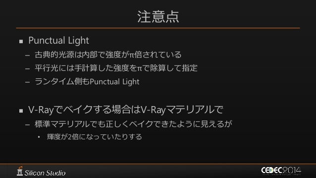 36. 36. 注意点  Punctual Light – 古典的光源は内部で強度がπ倍されている – 平行光には手計算した強度をπで除算して指定 – ランタイム側もPunctual Light  V-Rayでベイクする場合はV-Rayマテリアルで – 標準マテリアルでも正しくベイクできたように見えるが • 輝度が2倍になっていたりする