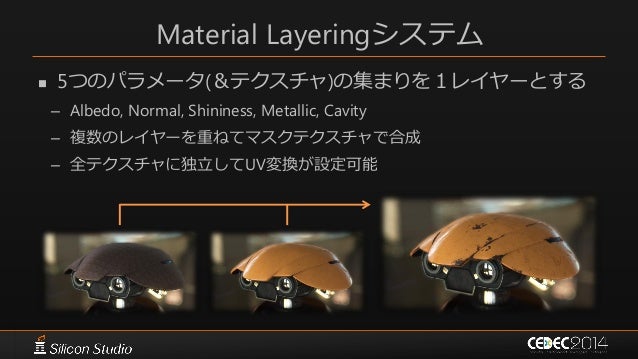 39. 39. Material Layeringシステム  5つのパラメータ(&テクスチャ)の集まりを1レイヤーとする – Albedo, Normal, Shininess, Metallic, Cavity – 複数のレイヤーを重ねてマスクテクスチャで合成 – 全テクスチャに独立してUV変換が設定可能