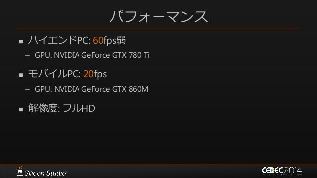 4. 4. パフォーマンス  ハイエンドPC: 60fps弱 – GPU: NVIDIA GeForce GTX 780 Ti  モバイルPC: 20fps – GPU: NVIDIA GeForce GTX 860M  解像度: フルHD