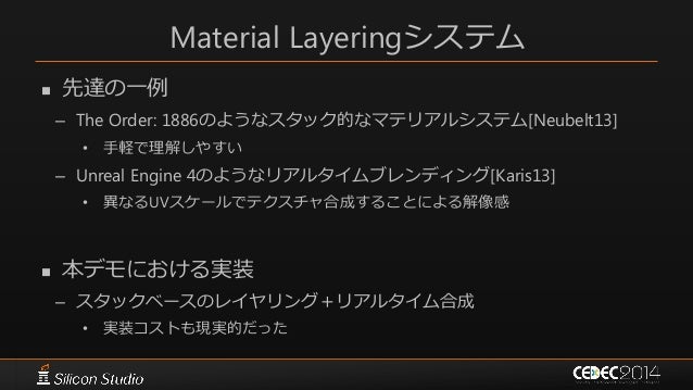 40. 40. Material Layeringシステム  先達の一例 – The Order: 1886のようなスタック的なマテリアルシステム[Neubelt13] • 手軽で理解しやすい – Unreal Engine 4のようなリアルタイムブレンディング[Karis13] • 異なるUVスケールでテクスチャ合成することによる解像感  本デモにおける実装 – スタックベースのレイヤリング+リアルタイム合成 • 実装コストも現実的だった