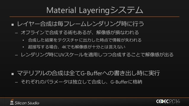 41. 41. Material Layeringシステム  レイヤー合成は毎フレームレンダリング時に行う – オフラインで合成する術もあるが、解像感が損なわれる • 合成した結果をテクスチャに出力した時点で情報が失われる • 超接写する場合、4Kでも解像感が十分とは言えない – レンダリング時にUVスケールを適用しつつ合成することで解像感が出る  マテリアルの合成は全てG-Bufferへの書き出し時に実行 – それぞれのパラメータは独立して合成し、G-Bufferに格納