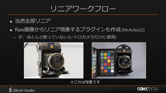 44. 44. リニアワークフロー  当然全部リニア  Raw画像からリニア現像するプラグインも作成 [McAuley12] – が、ほとんど使っていない(レトロカメラだけに使用) ※これは写真です