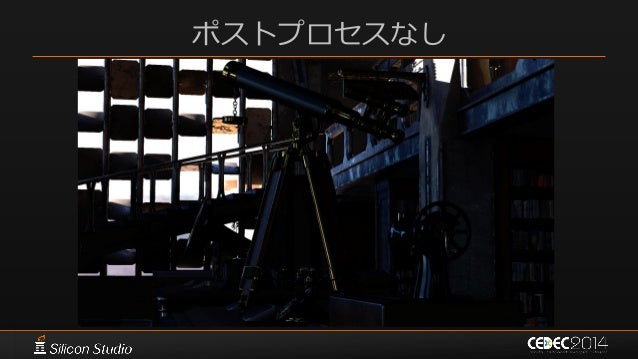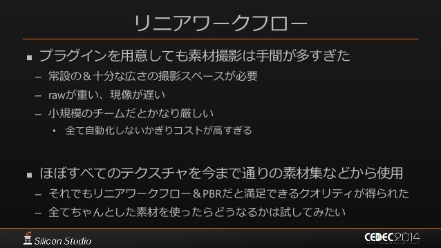 45. 45. リニアワークフロー  プラグインを用意しても素材撮影は手間が多すぎた – 常設の&十分な広さの撮影スペースが必要 – rawが重い、現像が遅い – 小規模のチームだとかなり厳しい • 全て自動化しないかぎりコストが高すぎる  ほぼすべてのテクスチャを今まで通りの素材集などから使用 – それでもリニアワークフロー&PBRだと満足できるクオリティが得られた – 全てちゃんとした素材を使ったらどうなるかは試してみたい
