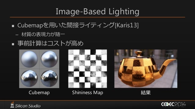 47. 47. Image-Based Lighting  Cubemapを用いた間接ライティング[Karis13] – 材質の表現力が随一  事前計算はコストが高め Cubemap Shininess Map 結果
