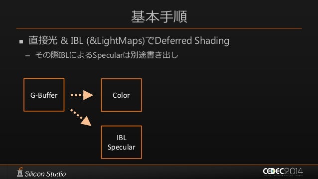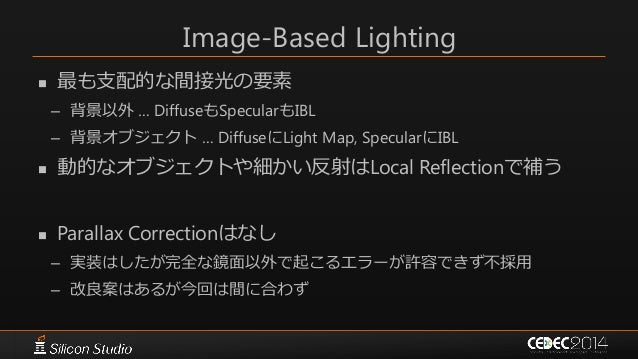 59. 59. Cubemapの結果のブレンディング  Deferred Shadingの際に分母と分子を独立して加算ブレンド – 最後にアルファ値で除算して正規化  簡単&基本的には充分な実装 – ただ精度の問題が起こりうるので多少工夫できる 𝐶𝑢𝑏𝑒𝑚𝑎𝑝1 𝜔𝑖 ∗ 𝑤1 + 𝐶𝑢𝑏𝑒𝑚𝑎𝑝2 𝜔𝑖 ∗ 𝑤2 𝑤1 + 𝑤2 𝑅𝐺𝐵 𝑐ℎ𝑎𝑛𝑛𝑒𝑙 𝐴𝑙𝑝ℎ𝑎 𝑐ℎ𝑎𝑛𝑛𝑒𝑙
