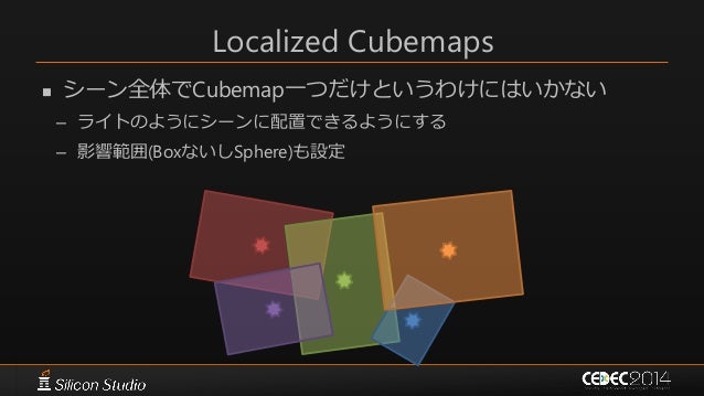 49. 49. Localized Cubemaps  シーン全体でCubemap一つだけというわけにはいかない – ライトのようにシーンに配置できるようにする – 影響範囲(BoxないしSphere)も設定