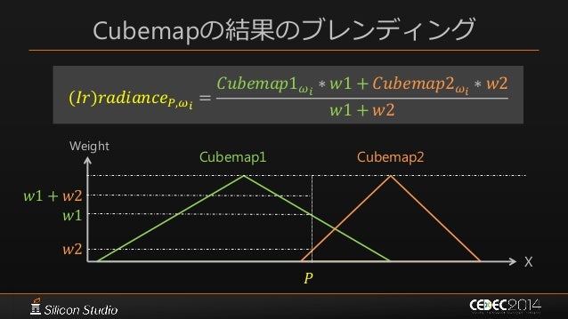 58. 58. Cubemapの結果のブレンディング 𝐼𝑟 𝑟𝑎𝑑𝑖𝑎𝑛𝑐𝑒 𝑃,𝜔𝑖 = 𝐶𝑢𝑏𝑒𝑚𝑎𝑝1 𝜔𝑖 ∗ 𝑤1 + 𝐶𝑢𝑏𝑒𝑚𝑎𝑝2 𝜔𝑖 ∗ 𝑤2 𝑤1 + 𝑤2 Cubemap1 Cubemap2 𝑃 𝑤1 Weight X 𝑤2 𝑤1 + 𝑤2