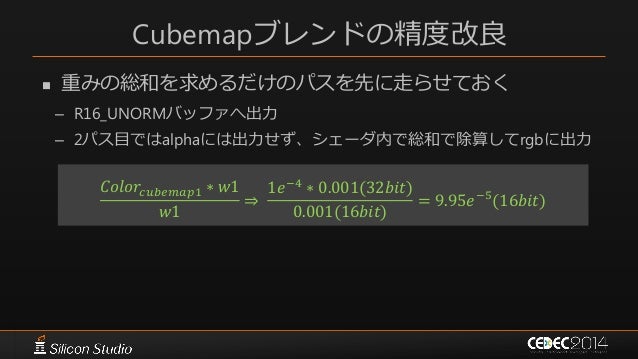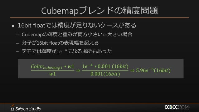 60. 60. Cubemapブレンドの精度問題  16bit floatでは精度が足りないケースがある – Cubemapの輝度と重みが両方小さいor大きい場合 – 分子が16bit floatの表現幅を超える – デモでは輝度が1𝑒−4になる場所もあった 𝐶𝑜𝑙𝑜𝑟𝑐𝑢𝑏𝑒𝑚𝑎𝑝1 ∗ 𝑤1 𝑤1 ⇒ 1𝑒−4 ∗ 0.001 (16𝑏𝑖𝑡) 0.001(16𝑏𝑖𝑡) ⇒ 5.96𝑒−5 (16𝑏𝑖𝑡)