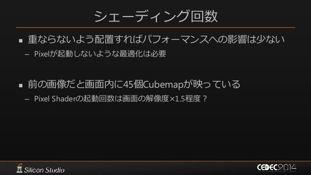 63. 63. シェーディング回数  重ならないよう配置すればパフォーマンスへの影響は少ない – Pixelが起動しないような最適化は必要  前の画像だと画面内に45個Cubemapが映っている – Pixel Shaderの起動回数は画面の解像度×1.5程度?