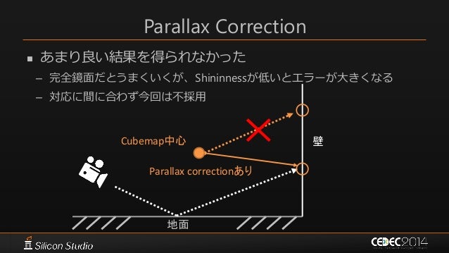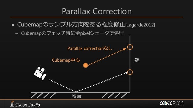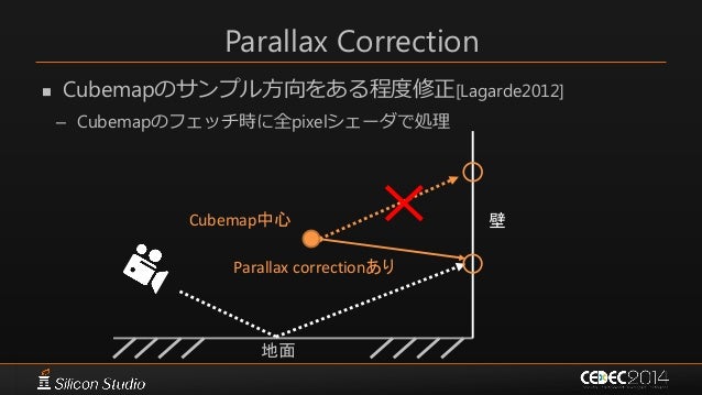 65. 65. Parallax Correction  Cubemapのサンプル方向をある程度修正[Lagarde2012] – Cubemapのフェッチ時に全pixelシェーダで処理 Parallax correctionあり Cubemap中心 地面 壁