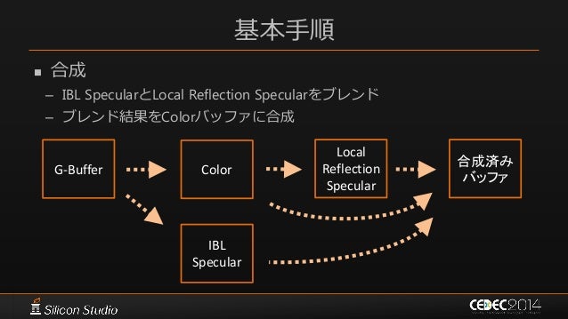 75. 75. 基本手順  合成 – IBL SpecularとLocal Reflection Specularをブレンド – ブレンド結果をColorバッファに合成 G-Buffer Color IBL Specular Local Reflection Specular 合成済み バッファ