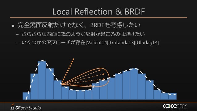 76. 76. Local Reflection & BRDF  完全鏡面反射だけでなく、BRDFを考慮したい – ざらざらな表面に鏡のような反射が起こるのは避けたい – いくつかのアプローチが存在[Valient14][Gotanda13][Uludag14]