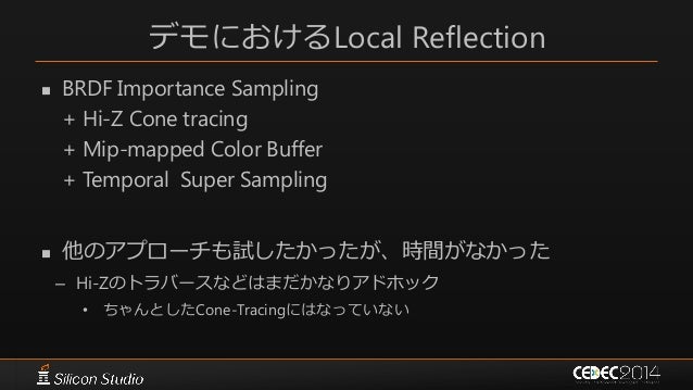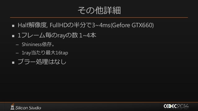 78. 78. その他詳細  Half解像度, FullHDの半分で3~4ms(Gefore GTX660)  1フレーム毎のrayの数 1~4本 – Shininess依存。 – 1ray当たり最大16tap  ブラー処理はなし