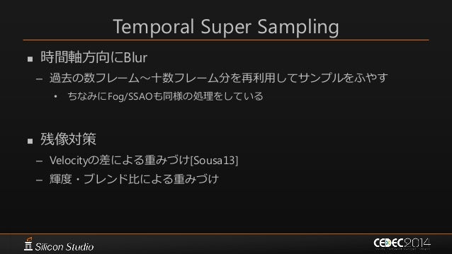 81. 81. Temporal Super Sampling  時間軸方向にBlur – 過去の数フレーム~十数フレーム分を再利用してサンプルをふやす • ちなみにFog/SSAOも同様の処理をしている  残像対策 – Velocityの差による重みづけ[Sousa13] – 輝度・ブレンド比による重みづけ