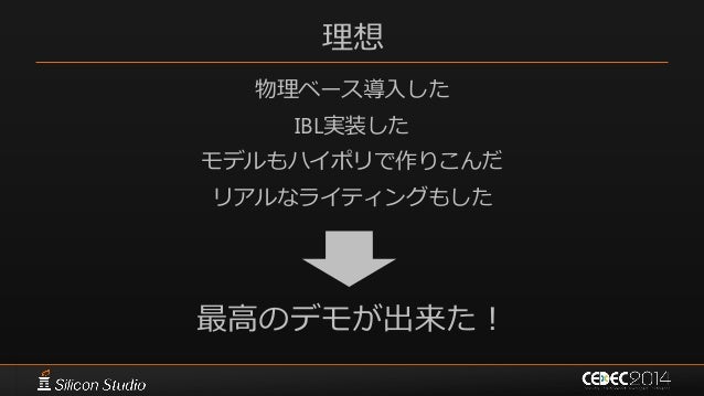 83. 83. 理想 物理ベース導入した IBL実装した モデルもハイポリで作りこんだ リアルなライティングもした 最高のデモが出来た!