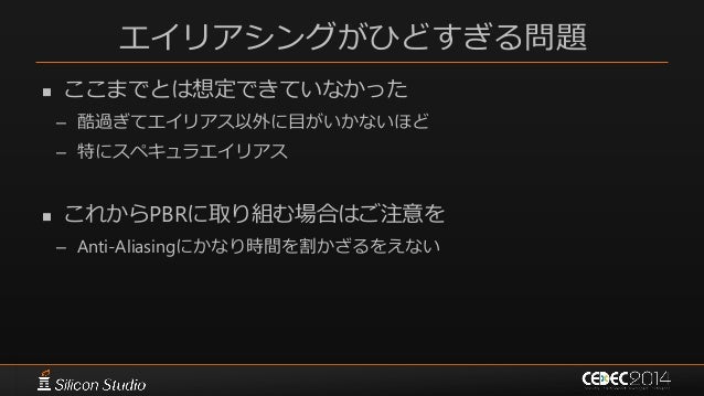 85. 85. エイリアシングがひどすぎる問題  ここまでとは想定できていなかった – 酷過ぎてエイリアス以外に目がいかないほど – 特にスペキュラエイリアス  これからPBRに取り組む場合はご注意を – Anti-Aliasingにかなり時間を割かざるをえない