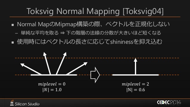 87. 87. Toksvig Normal Mapping [Toksvig04]  Normal MapのMipmap構築の際、ベクトルを正規化しない – 単純な平均を取る ⇒ 下の階層の法線の分散が大きいほど短くなる  使用時にはベクトルの長さに応じてshininessを抑え込む 𝑚𝑖𝑝𝑙𝑒𝑣𝑒𝑙 = 0 |𝑁| = 1.0 𝑚𝑖𝑝𝑙𝑒𝑣𝑒𝑙 = 2 |N| = 0.6