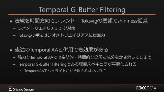 88. 88. Temporal G-Buffer Filtering  法線を時間方向でブレンド + Toksvigの要領でshininess低減 – ジオメトリエイリアシング対策 – Toksvigの手法はジオメトリエイリアスには無力  後述のTemporal AAと併用でも効果がある – 強力なTemporal AAでは空間的・時間的な高周波成分をかき消してしまう – Temporal G-Buffer Filteringである程度スペキュラが平滑化される • TemporalAAでハイライトがかき消されないように