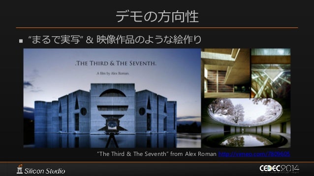 9. 9. デモの方向性  “まるで実写” & 映像作品のような絵作り “The Third & The Seventh” from Alex Roman http://vimeo.com/7809605