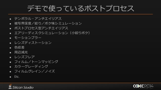 91. 91. デモで使っているポストプロセス  テンポラル・アンチエイリアス  被写界深度/絞り/ボケ味シミュレーション  ポストプロセス型アンチエイリアス  エアリーディスクシミュレーション(小絞りボケ)  モーションブラー  レンズディストーション  色収差  周辺減光  レンズフレア  フィルム/トーンマッピング  カラーグレーディング  フィルムグレイン/ノイズ  Etc.