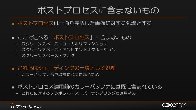 92. 92. ポストプロセスに含まないもの  ポストプロセスは一通り完成した画像に対する処理とする  ここで述べる「ポストプロセス」に含まないもの – スクリーンスペース・ローカルリフレクション – スクリーンスペース・アンビエントオクルージョン – スクリーンスペース・フォグ  これらはシェーディングの一環として処理 – カラーバッファ合成以前に必要になるため  ポストプロセス適用前のカラーバッファには既に含まれている – これらに対するテンポラル・スーパーサンプリングも適用済み