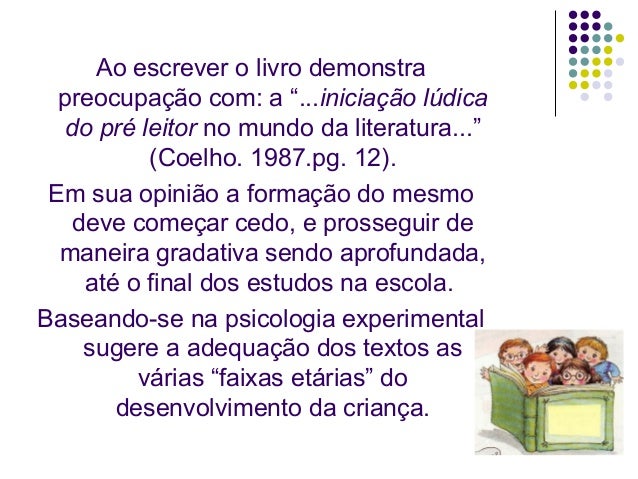 10. 10. Ao escrever o livro demonstra preocupação com: a “...iniciação lúdica do pré leitor no mundo da literatura...” (Coelho. 1987.pg. 12). Em sua opinião a formação do mesmo deve começar cedo, e prosseguir de maneira gradativa sendo aprofundada, até o final dos estudos na escola.Baseando-se na psicologia experimental sugere a adequação dos textos as várias “faixas etárias” do desenvolvimento da criança.