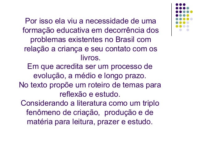 11. 11. Por isso ela viu a necessidade de uma formação educativa em decorrência dos problemas existentes no Brasil com relação a criança e seu contato com os livros. Em que acredita ser um processo de evolução, a médio e longo prazo.No texto propõe um roteiro de temas para reflexão e estudo.Considerando a literatura como um triplo fenômeno de criação, produção e de matéria para leitura, prazer e estudo.