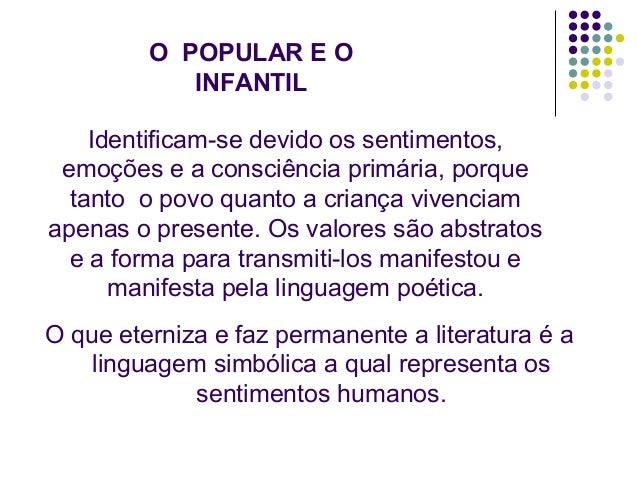 12. 12. O POPULAR E O INFANTIL Identificam-se devido os sentimentos, emoções e a consciência primária, porque tanto o povo quanto a criança vivenciamapenas o presente. Os valores são abstratos e a forma para transmiti-los manifestou e manifesta pela linguagem poética.O que eterniza e faz permanente a literatura é a linguagem simbólica a qual representa os sentimentos humanos.