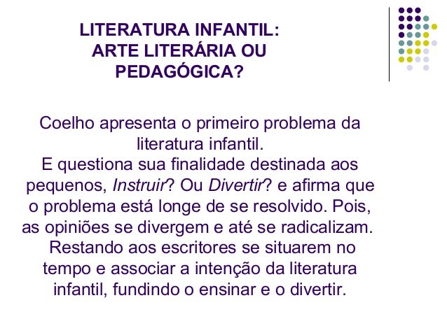 13. 13. LITERATURA INFANTIL: ARTE LITERÁRIA OU PEDAGÓGICA? Coelho apresenta o primeiro problema da literatura infantil. E questiona sua finalidade destinada aospequenos, Instruir? Ou Divertir? e afirma que o problema está longe de se resolvido. Pois,as opiniões se divergem e até se radicalizam. Restando aos escritores se situarem no tempo e associar a intenção da literatura infantil, fundindo o ensinar e o divertir.