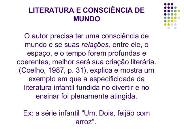 14. 14. LITERATURA E CONSCIÊNCIA DE MUNDO O autor precisa ter uma consciência de mundo e se suas relações, entre ele, o espaço, e o tempo forem profundas ecoerentes, melhor será sua criação literária. (Coelho, 1987, p. 31), explica e mostra um exemplo em que a especificidade da literatura infantil fundida no divertir e no ensinar foi plenamente atingida. Ex: a série infantil “Um, Dois, feijão com arroz”.