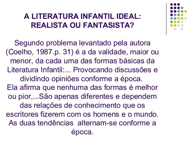15. 15. A LITERATURA INFANTIL IDEAL: REALISTA OU FANTASISTA? Segundo problema levantado pela autora(Coelho, 1987.p. 31) é a da validade, maior ou menor, da cada uma das formas básicas da Literatura Infantil:... Provocando discussões e dividindo opiniões conforme a época.Ela afirma que nenhuma das formas é melhor ou pior,...São apenas diferentes e dependem das relações de conhecimento que osescritores fizerem com os homens e o mundo. As duas tendências alternam-se conforme a época.