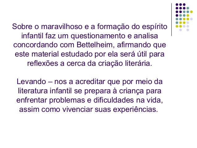 16. 16. Sobre o maravilhoso e a formação do espírito infantil faz um questionamento e analisaconcordando com Bettelheim, afirmando que este material estudado por ela será útil para reflexões a cerca da criação literária. Levando – nos a acreditar que por meio da literatura infantil se prepara à criança para enfrentar problemas e dificuldades na vida, assim como vivenciar suas experiências.