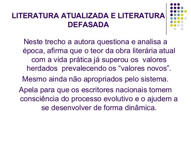 17. 17. LITERATURA ATUALIZADA E LITERATURA DEFASADA Neste trecho a autora questiona e analisa a época, afirma que o teor da obra literária atual com a vida prática já superou os valores herdados prevalecendo os “valores novos”. Mesmo ainda não apropriados pelo sistema. Apela para que os escritores nacionais tomem consciência do processo evolutivo e o ajudem a se desenvolver de forma dinâmica.