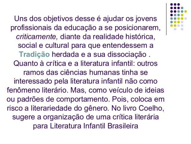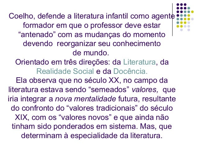 8. 8. Coelho, defende a literatura infantil como agente formador em que o professor deve estar “antenado” com as mudanças do momento devendo reorganizar seu conhecimento de mundo. Orientado em três direções: da Literatura, da Realidade Social e da Docência. Ela observa que no século XX, no campo daliteratura estava sendo “semeados” valores, queiria integrar a nova mentalidade futura, resultante do confronto do “valores tradicionais” do século XIX, com os “valores novos” e que ainda não tinham sido ponderados em sistema. Mas, que determinam à especialidade da literatura.