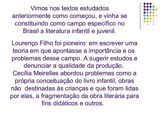 2. 2. Vimos nos textos estudadosanteriormente como começou, e vinha se constituindo como campo específico no Brasil a literatura infantil e juvenil.Lourenço Filho foi pioneiro em escrever uma teoria em que apontasse a importância e osproblemas desse campo. A sugerir estudos e denunciar a qualidade da produção. Cecília Meirelles abordou problemas como a própria conceituação do livro infantil, obrasnão destinadas às crianças e que foram lidaspor elas, a fragmentação da obra literária para fins didáticos e outros.
