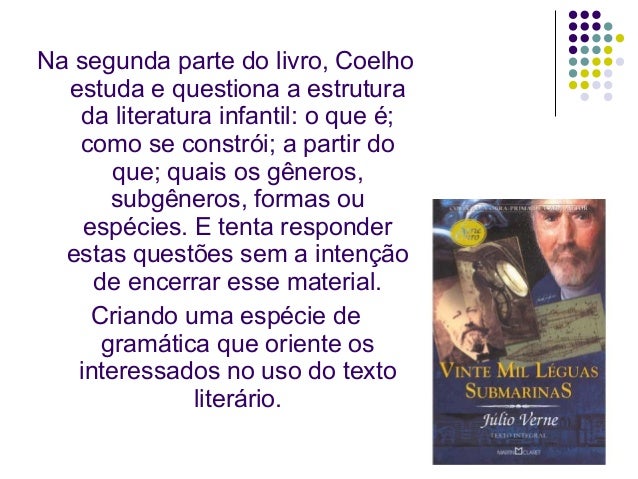 20. 20. Na segunda parte do livro, Coelho estuda e questiona a estrutura da literatura infantil: o que é; como se constrói; a partir do que; quais os gêneros, subgêneros, formas ou espécies. E tenta responder estas questões sem a intenção de encerrar esse material. Criando uma espécie de gramática que oriente os interessados no uso do texto literário.
