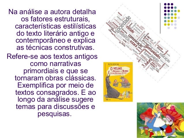 21. 21. Na análise a autora detalha os fatores estruturais, características estilísticas do texto literário antigo e contemporâneo e explica as técnicas construtivas.Refere-se aos textos antigos como narrativas primordiais e que se tornaram obras clássicas. Exemplifica por meio de textos consagrados. E ao longo da análise sugere temas para discussões e pesquisas.