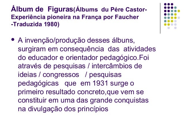 23. 23. Álbum de Figuras(Álbums du Pére Castor-Experiência pioneira na França por Faucher-Traduzida 1980) A invenção/produção desses álbuns, surgiram em consequência das atividades do educador e orientador pedagógico.Foi através de pesquisas / intercâmbios de ideias / congressos / pesquisas pedagógicas que em 1931 surge o primeiro resultado concreto,que vem se constituir em uma das grande conquistas na divulgação dos princípios