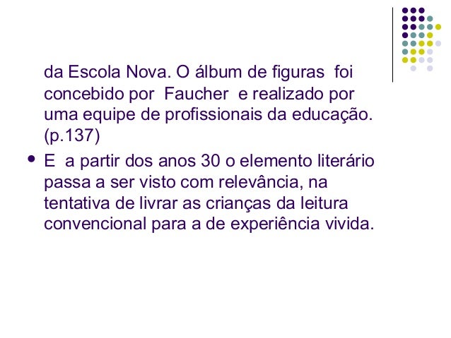 24. 24. da Escola Nova. O álbum de figuras foi concebido por Faucher e realizado por uma equipe de profissionais da educação. (p.137) E a partir dos anos 30 o elemento literário passa a ser visto com relevância, na tentativa de livrar as crianças da leitura convencional para a de experiência vivida.