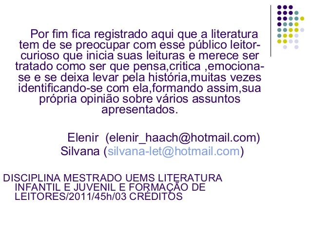 26. 26. Por fim fica registrado aqui que a literatura tem de se preocupar com esse público leitor- curioso que inicia suas leituras e merece ser tratado como ser que pensa,critica ,emociona- se e se deixa levar pela história,muitas vezes identificando-se com ela,formando assim,sua própria opinião sobre vários assuntos apresentados. Elenir (elenir_haach@hotmail.com) Silvana (silvana-let@hotmail.com)DISCIPLINA MESTRADO UEMS LITERATURA INFANTIL E JUVENIL E FORMAÇÃO DE LEITORES/2011/45h/03 CRÉDITOS