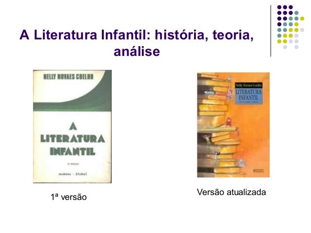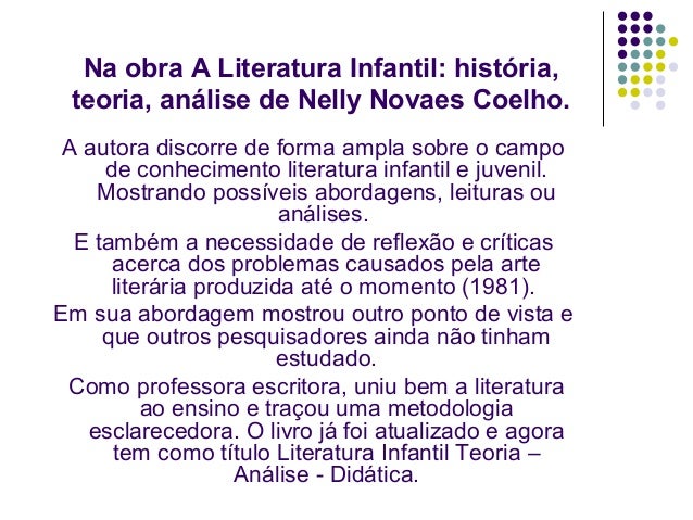 5. 5. Na obra A Literatura Infantil: história, teoria, análise de Nelly Novaes Coelho. A autora discorre de forma ampla sobre o campo de conhecimento literatura infantil e juvenil. Mostrando possíveis abordagens, leituras ou análises. E também a necessidade de reflexão e críticas acerca dos problemas causados pela arte literária produzida até o momento (1981).Em sua abordagem mostrou outro ponto de vista e que outros pesquisadores ainda não tinham estudado. Como professora escritora, uniu bem a literatura ao ensino e traçou uma metodologia esclarecedora. O livro já foi atualizado e agora tem como título Literatura Infantil Teoria – Análise - Didática.
