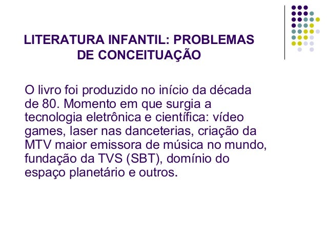 6. 6. LITERATURA INFANTIL: PROBLEMAS DE CONCEITUAÇÃOO livro foi produzido no início da décadade 80. Momento em que surgia atecnologia eletrônica e científica: vídeogames, laser nas danceterias, criação daMTV maior emissora de música no mundo,fundação da TVS (SBT), domínio doespaço planetário e outros.